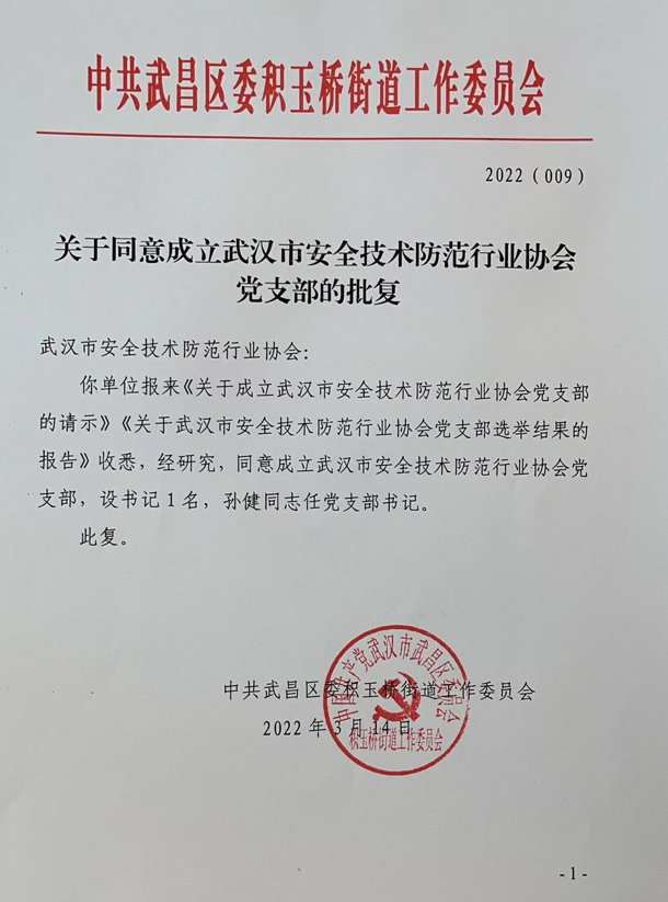 ? ? ? ? 2022年3月14日,經中共武昌區委積玉橋街道工作委員會同意,武漢市安全技術防范行業協會黨支部正式成立,協會監事孫健同志擔任武漢市安全技術防范行業協會黨支部書記,武漢市公安局科信處四級主任姚東明同志擔任協會黨建指導員。