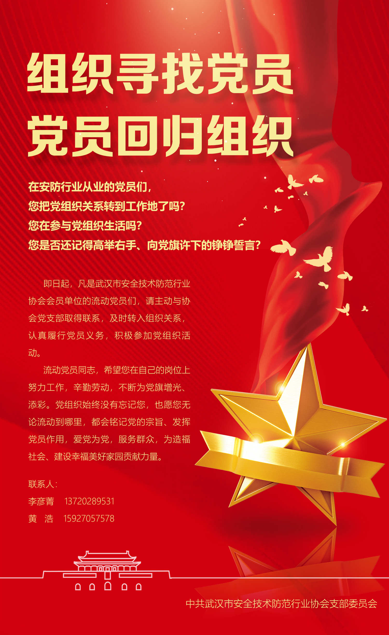 即日起,凡是武漢市安全技術防范行業協會會員單位的流動黨員們,請主動與協會黨支部取得聯系,及時轉入組織關系,認真履行黨員義務,積極參加黨組織活動。