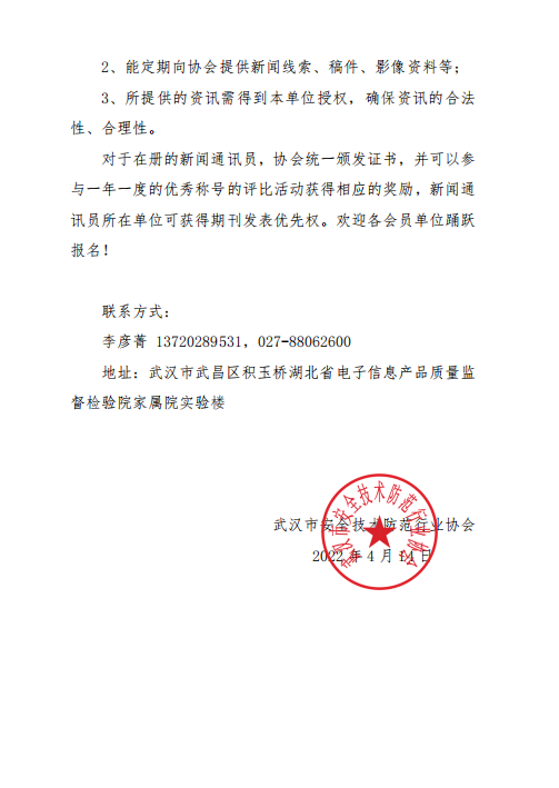 新聞通訊員提供本公司的黨建工作、新聞動態、活動通知、創新理念、新產品發布、解決方案等,協會收到稿件經審核通過后,會及時通過協會官網、微信公眾號、《武漢安防》期刊幫助各會員單位進行推廣和宣傳。