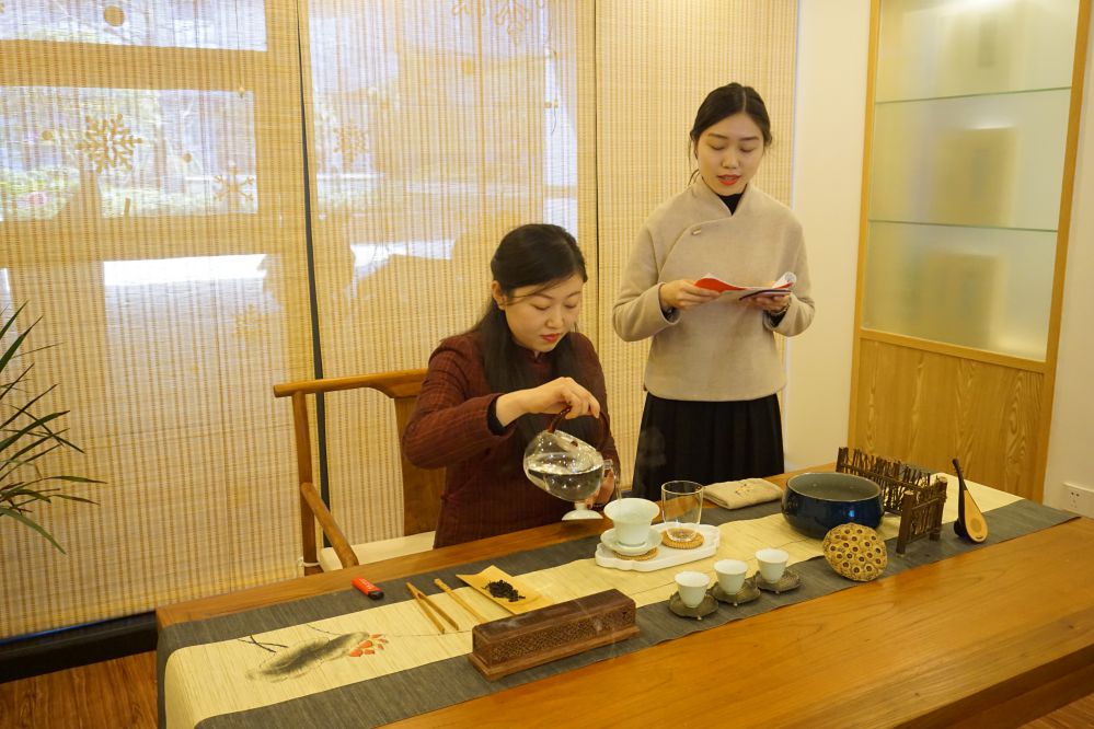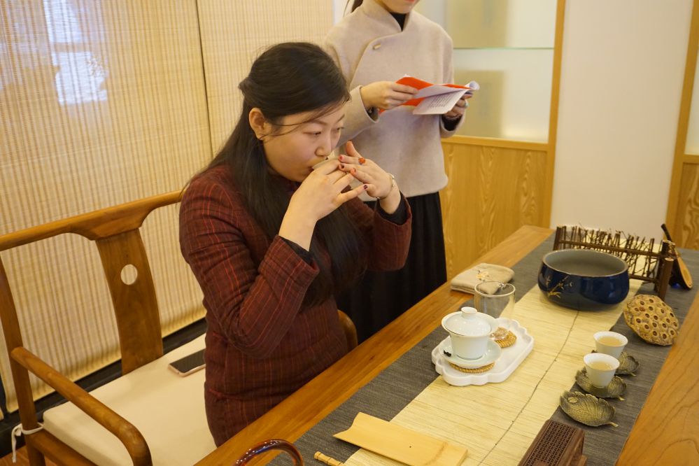 “第一道:焚香靜氣、活煮甘泉。。。。。。”“第二道:孔雀開屏、葉嘉酬賓。。。。。”隨著一道道程序的講解,茶藝師手指輕翻為大家演示,現(xiàn)場的女會員們看的目不轉(zhuǎn)睛,紛紛感嘆道中國茶藝的從容優(yōu)雅。在幽幽的檀香和茶香中,感受著茶藝帶來的平和。