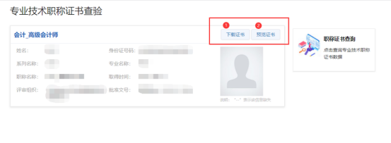 根據取得職稱的時間,在頁面下輸入對應的姓名、身份證號及專業即可查詢到職稱電子證書信息。