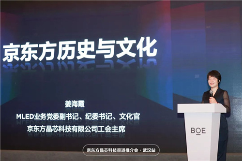 京東方晶芯科技有限公司MLED業務黨委副書記、紀委書記、文化官姜海霞帶來了“京東方歷史與文化”主題演講。作為京東方的制勝法寶,以創新源動力和文化內驅力的維度講述了京東方的發展歷史、現有規模以及文化愿景。