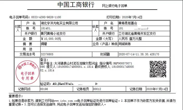 同日,在董事長廖孝彪、總經理龔茂清的倡導下,湖北宇洪通過黃梅縣慈善會向黃梅縣大河鎮袁山村泥石流災害中的遇難者捐贈10000元善款,并向遇難者家屬表示親切慰問。