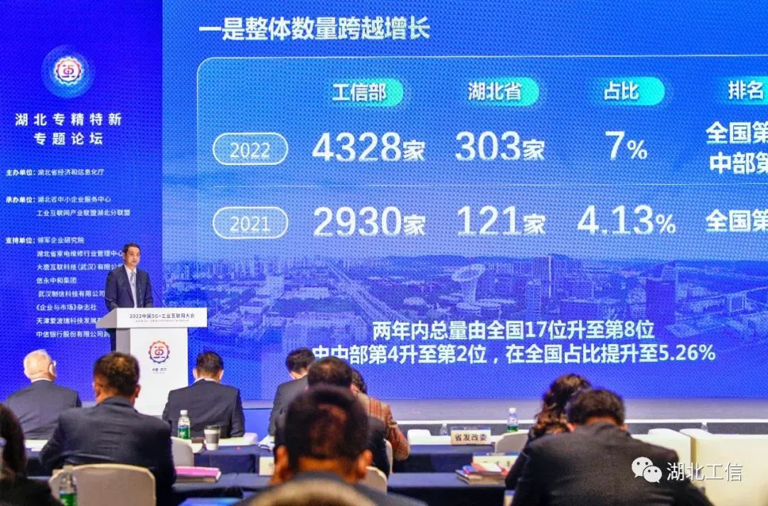 11月21日上午,2022中國5G+工業(yè)互聯(lián)網(wǎng)大會湖北專精特新專題論壇在光谷科技會展中心舉行。省經(jīng)信廳黨組書記、廳長劉海軍在論壇上發(fā)布《湖北省專精特新企業(yè)發(fā)展報告》。