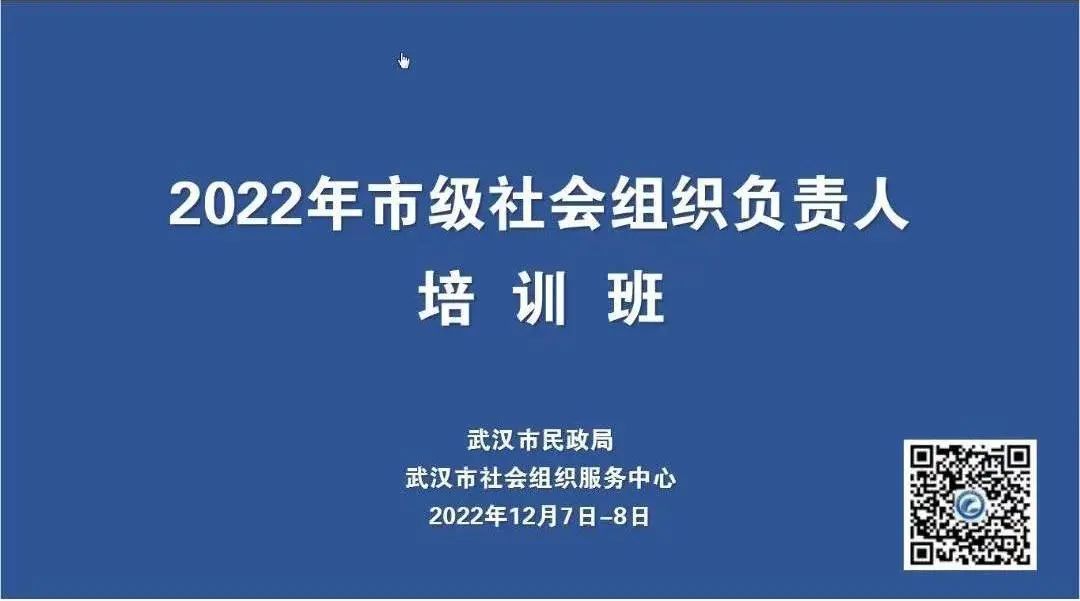 12月7日至8日,2022年市級社會組織負責人線上培訓班在武漢市社會組織黨建服務中心成功舉辦。此次培訓采取線上授課方式進行,市級社會組織會長(副會長)、理事長(副理事長)、秘書長等1424人次參加了培訓,市社會組織綜合黨委副書記、市民政局社會組織管理和黨建工作處負責人出席開班儀式并講話。秘書長陳虎和秘書處主任李彥菁參加了本次線上培訓班。