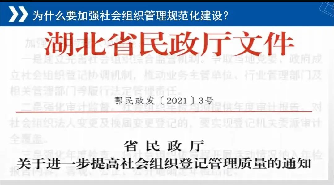 課堂上,老師講解了[2021]3號湖北省民政廳文件,《省民政廳 關于進一步提高社會組織登記管理質量的通知》,建立完善社會組織綜合管理機制;強化審計監督;強化年度檢查;強化現場檢查;推進監管“關口”前移;完善社會組織重大活動報告制度。