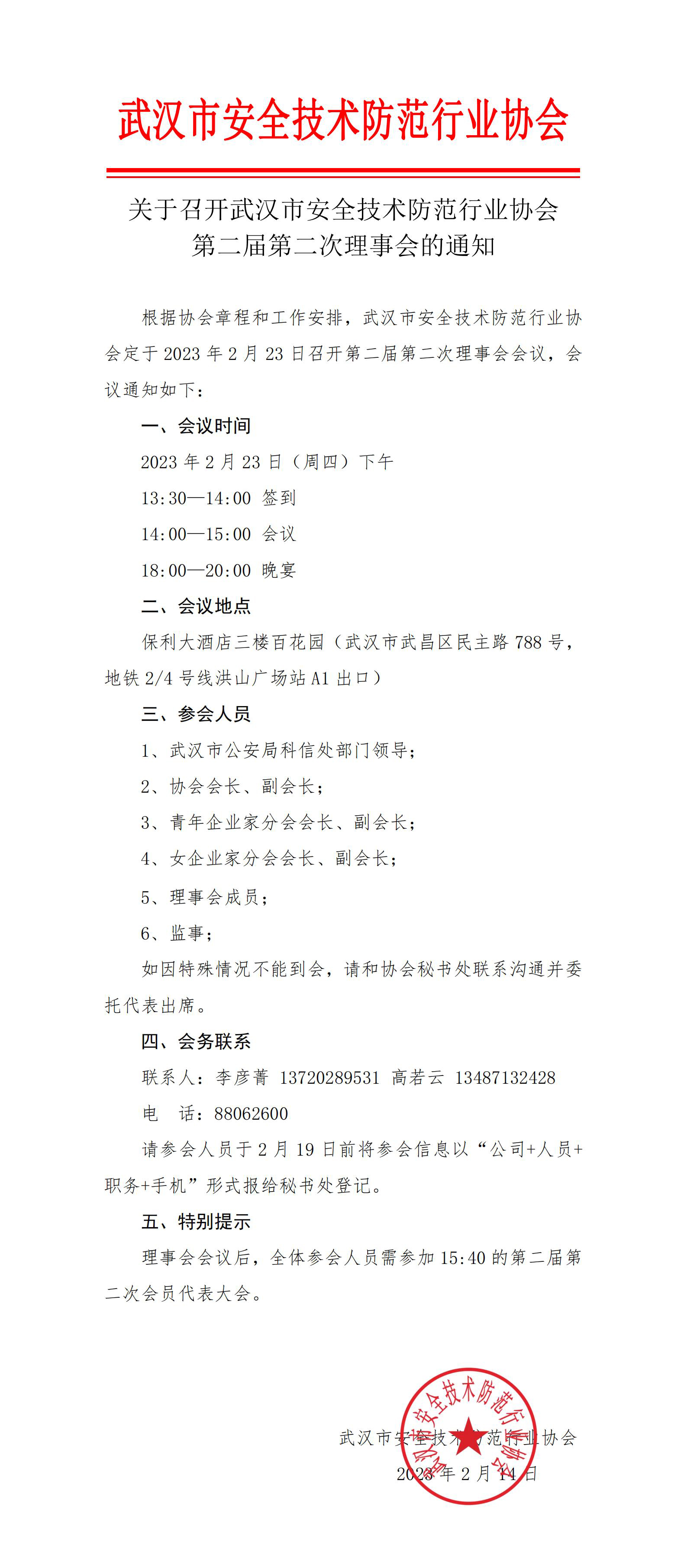 根據協會章程和工作安排,武漢市安全技術防范行業協會定于2023年2月23日召開第二屆第二次理事會會議,會議通知如下: