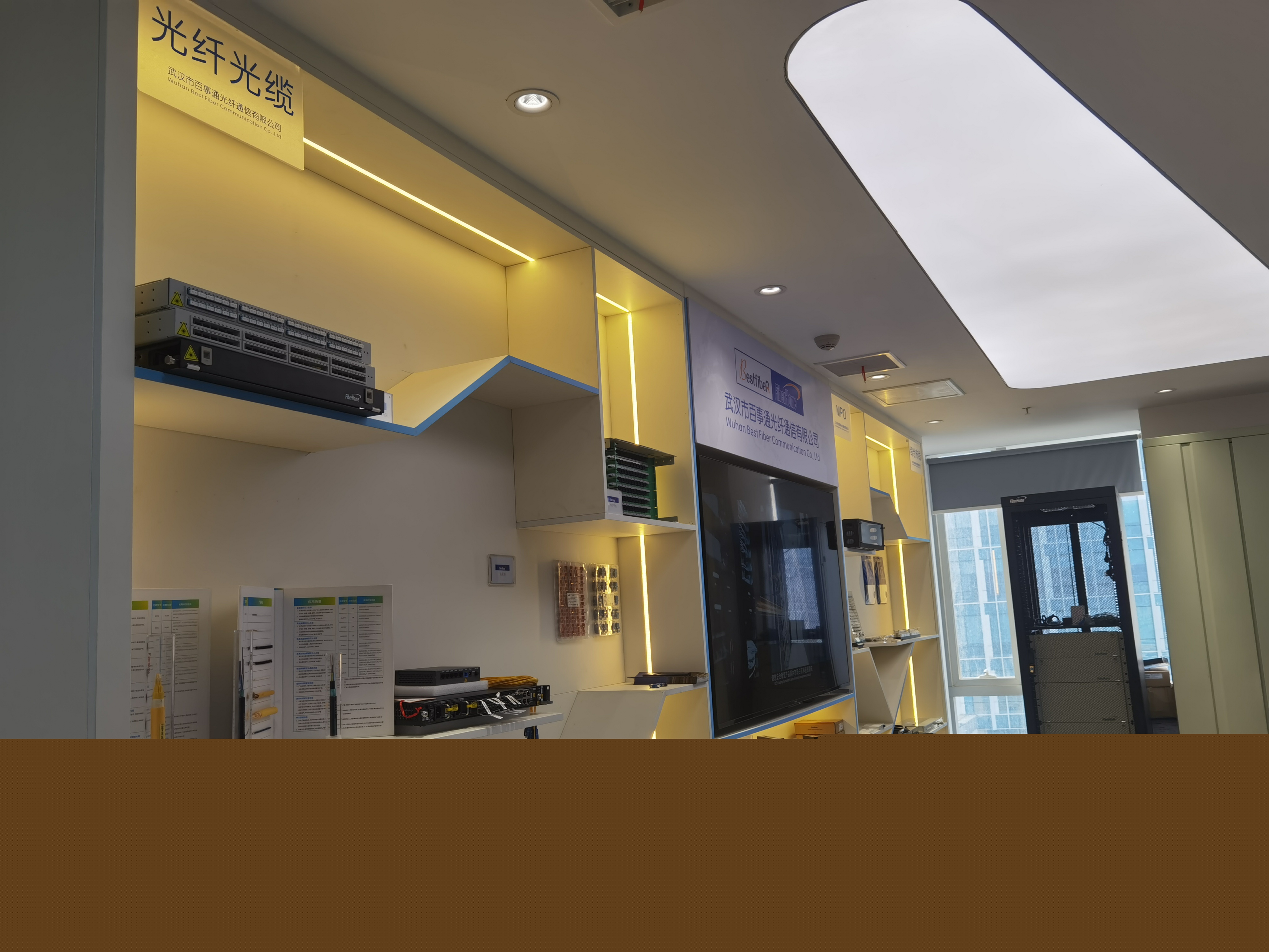 武漢市百事通光纖通信有限公司總經(jīng)理黃登紅帶領(lǐng)大家參觀了公司,產(chǎn)品展區(qū)。