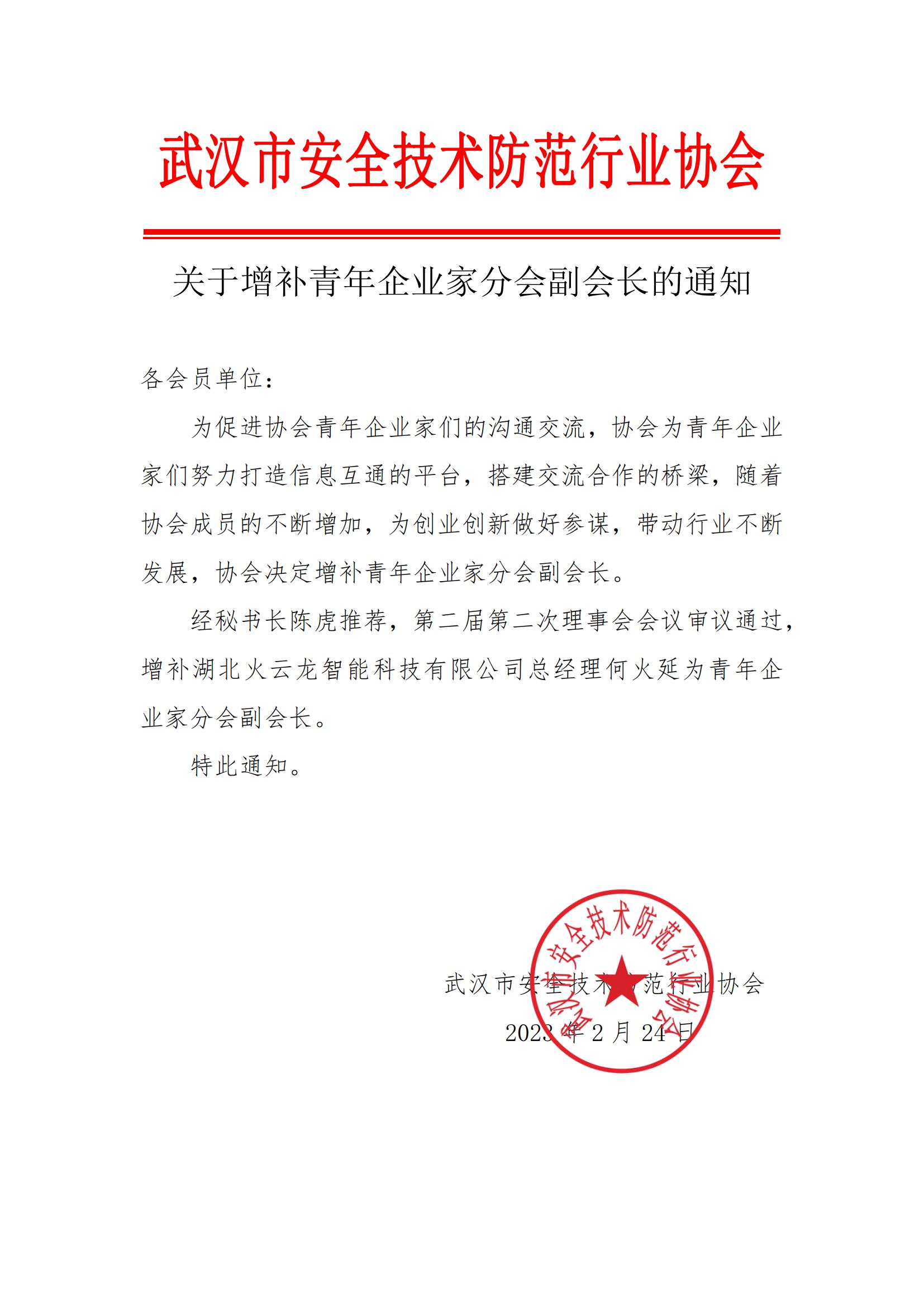 經秘書長陳虎推薦,第二屆第二次理事會會議審議通過,增補湖北火云龍智能科技有限公司總經理何火延為青年企業家分會副會長。