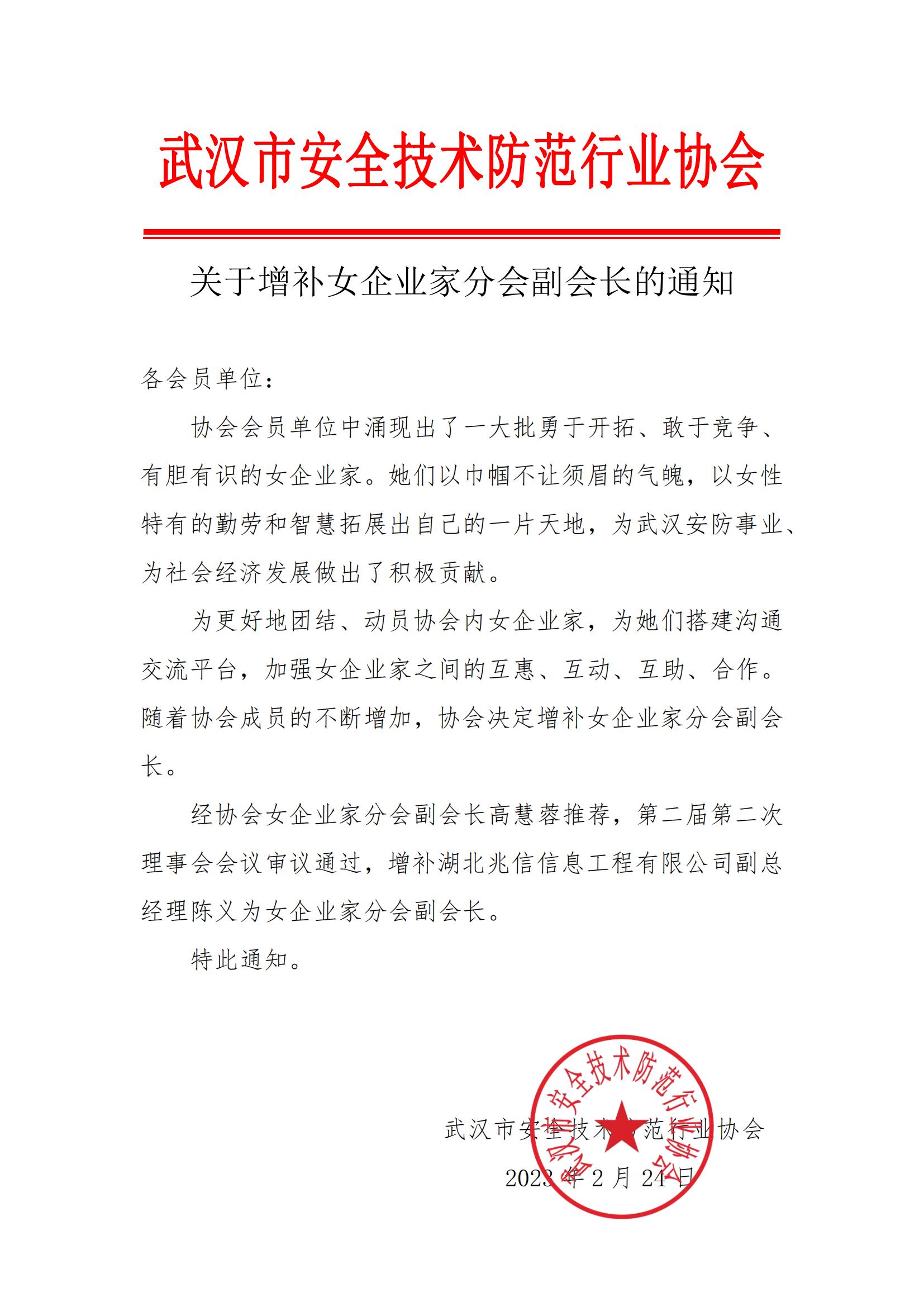 經協會女企業家分會副會長高慧蓉推薦,第二屆第二次理事會會議審議通過,增補湖北兆信信息工程有限公司副總經理陳義為女企業家分會副會長。