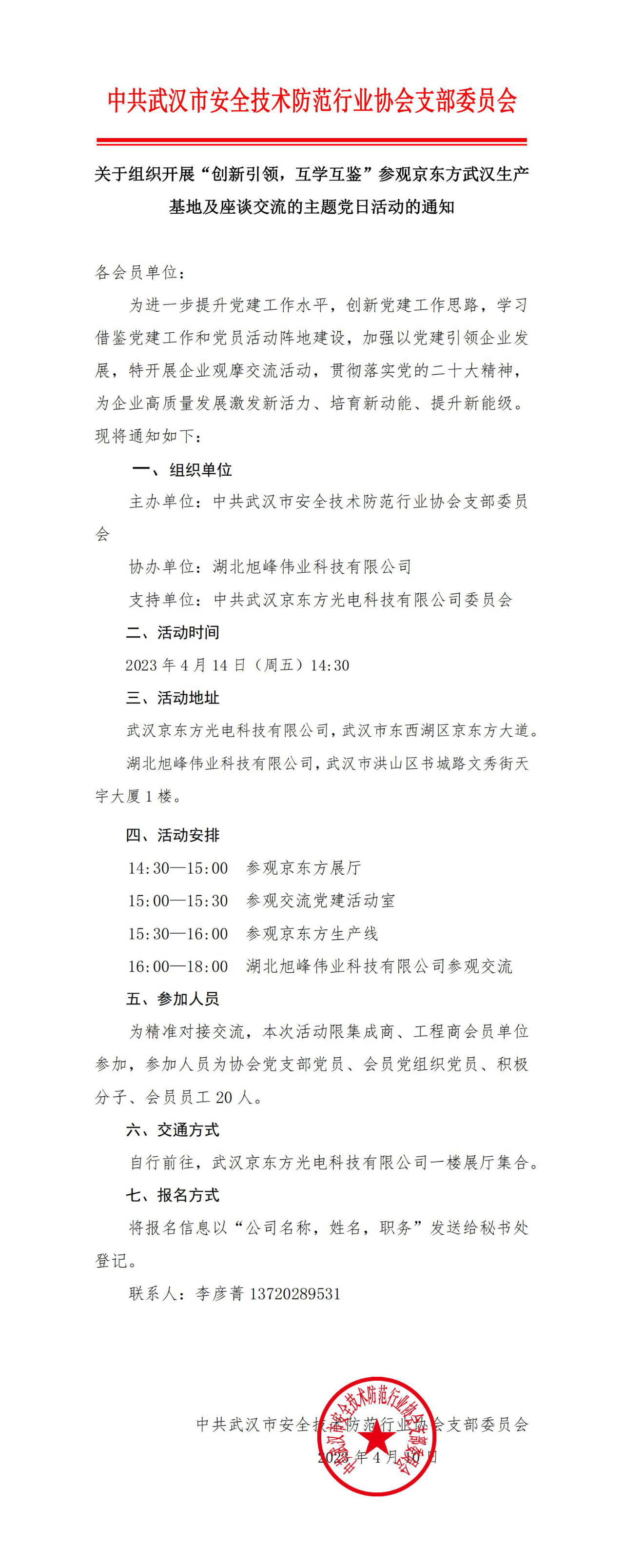 關(guān)于組織開(kāi)展“創(chuàng)新引領(lǐng),互學(xué)互鑒”參觀京東方武漢生產(chǎn)基地及座談交流的主題黨日活動(dòng)的通知