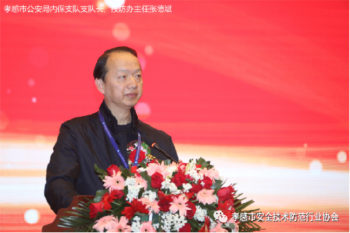 ? ? ? ?孝感市公安局技防辦主任、內(nèi)保支隊(duì)長張德斌講話,祝賀協(xié)會(huì)成功換屆,要求協(xié)會(huì)努力服務(wù)好會(huì)員單位,規(guī)范全市安防行業(yè)發(fā)展并祝愿協(xié)會(huì)逐夢(mèng)新征程、激發(fā)新動(dòng)力。