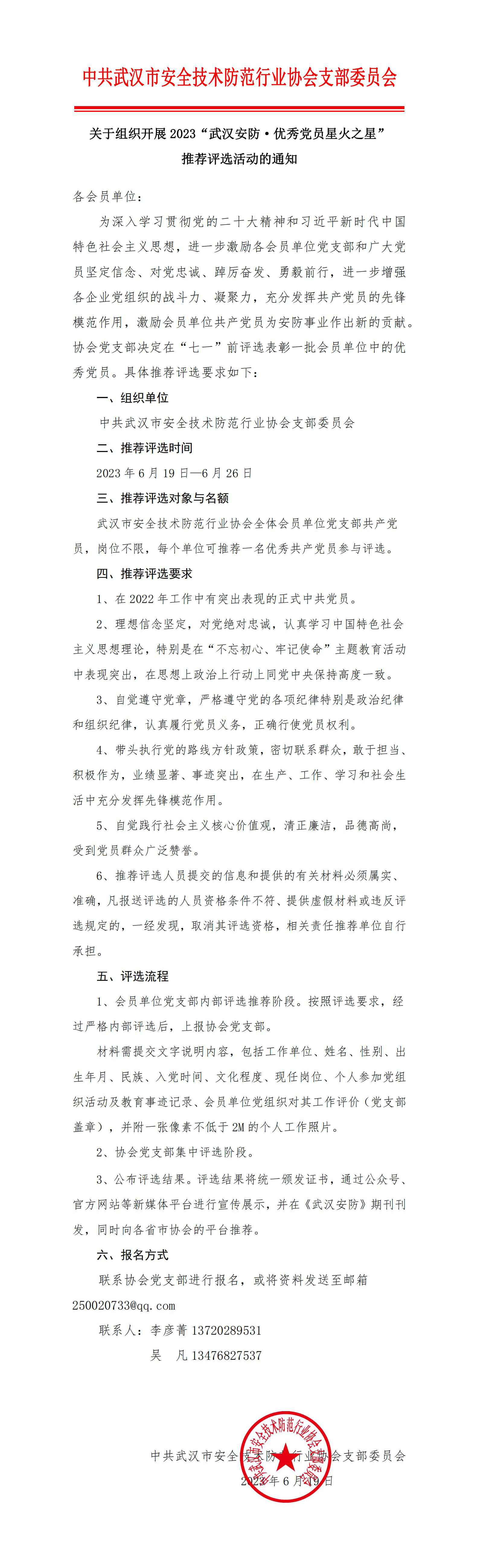 關于組織開展2023“武漢安防·優秀黨員星火之星”推薦評選活動的通知
