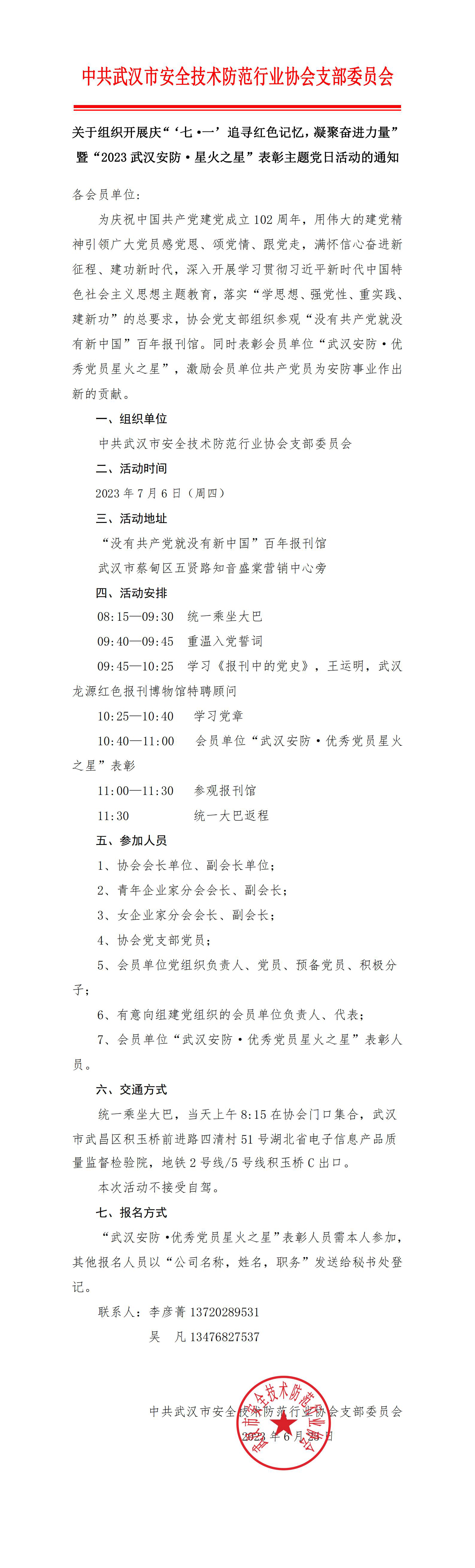 關于組織開展慶“‘七·一’追尋紅色記憶,凝聚奮進力量”暨“2023武漢安防·星火之星”表彰主題黨日活動的通知