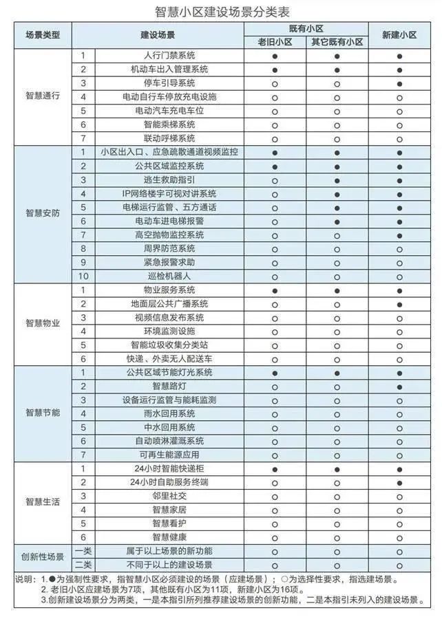 《指引》提出了智慧通行、智慧安防、智慧物業、智慧節能、智慧生活等5大類36個不同類型的智慧小區場景,建議按既有小區和新建小區分類分級、因地制宜推進,鼓勵在此基礎上建設創新性場景。