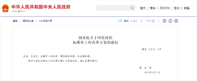 ? ? ? ? ?2015年3月,國務院發布深化標準化工作改革方案,第一次將團體標準作為國家標準體系的一部分。