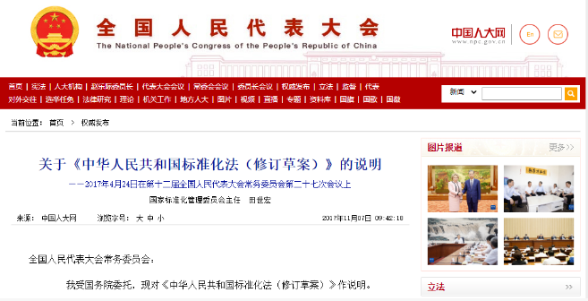 ? ? ? ? ?2017年11月,全國人民代表大會常務委員會對《中華人民共和國標準化法》進行了修訂,從法律上進一步明確了團體標準的地位。