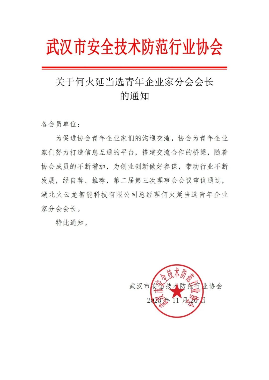 關(guān)于何火延當(dāng)選青年企業(yè)家分會會長的通知