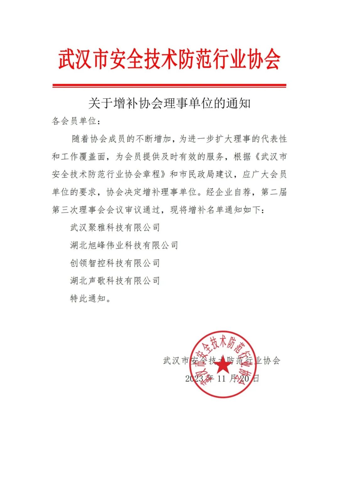 ? ? ? ? 隨著協(xié)會成員的不斷增加,為進一步擴大理事的代表性和工作覆蓋面,為會員提供及時有效的服務,根據(jù)《武漢市安全技術防范行業(yè)協(xié)會章程》和市民政局建議,應廣大會員單位的要求,協(xié)會決定增補理事單位。經(jīng)企業(yè)自薦,第二屆第三次理事會會議審議通過,現(xiàn)將增補名單通知如下: