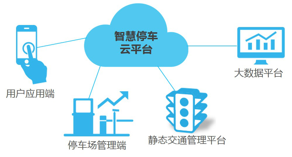 智慧停車平臺由云平臺、用戶應用端、停車場管理端、大數據平臺、靜態交通管理平臺構成。