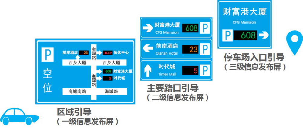 道路停車誘導體系:區域引導、主要路口引導、停車場入口引導,三級誘導體系。