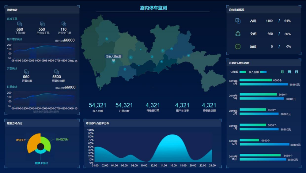運營數據可視化:實時車位,車位傳感器數據實時同步停車場系統,車位使用情況一目了然;使用率,系統自動統計計算停車場每日各時段車位使用率,后臺可自由選擇統計時間范圍,系統自動生成對應可視化統計圖表;停車時長,系統自動統計所有車輛停車時長,后臺可對各時段時長占比進行分析,生成可視化圖表;營收數據,系統自動統計營收數據,后臺可篩選查看各時段停車收入,繳費方式占比,生成可視化圖表;充電樁,充電樁收入、使用率、使用時段、使用時長統計分析,生成可視化圖表。