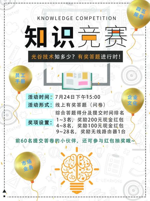 除了完善各項(xiàng)人才培養(yǎng)管理機(jī)制,光谷技術(shù)還通過多種創(chuàng)新方式,鼓勵(lì)全員不斷學(xué)習(xí)。2020年7月,光谷技術(shù)開展線上有獎(jiǎng)知識競答,將企業(yè)相關(guān)知識編輯成趣味問答,并設(shè)置獎(jiǎng)勵(lì),通過在線小程序,號召大家參與其中,以此激勵(lì)員工深入學(xué)習(xí)了解公司企業(yè)文化、發(fā)展規(guī)劃、最新政策、市場動(dòng)態(tài)等,員工學(xué)習(xí)熱情高漲,活動(dòng)效果顯著。