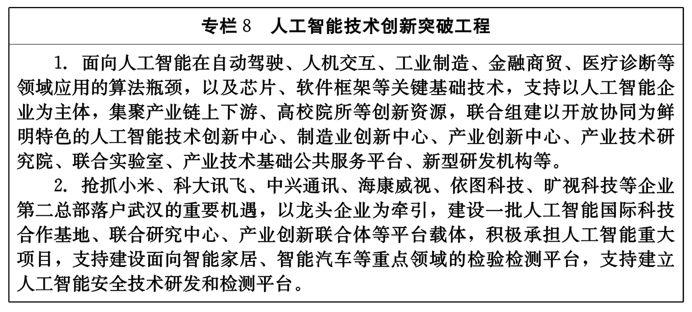 ——關鍵技術實現多點突破。深度學習、語音識別、計算機視覺、自然語言處理、智能傳感器、神經網絡芯片等關鍵核心技術取得重要突破,獲得一批標志性科研成果。培育一批人工智能領軍人才和創新團隊,形成創新生態體系,將武漢打造成為全國人工智能創新引領區。