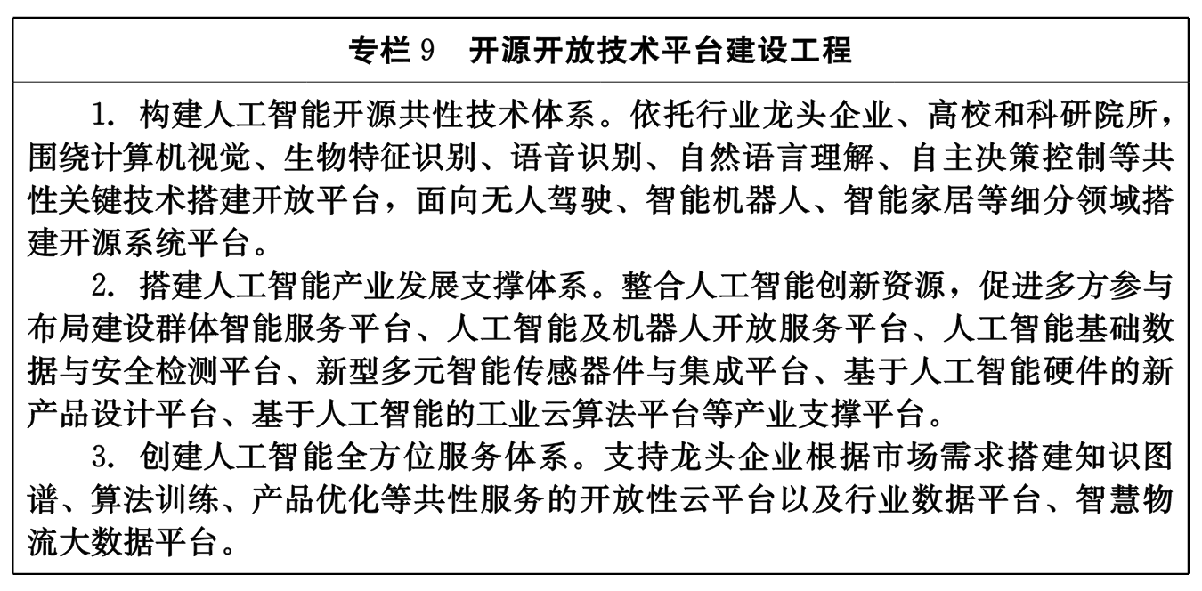 整體提升人工智能行業創新支撐能力,有效降低中小微企業研發成本,支持企業聯合高校、科研院所建設產學研用協同創新研發平臺,搭建數據開放平臺、開源開放共性技術平臺,鼓勵各類創新主體建設行業公共服務平臺,促進人才要素等創新資源集聚。