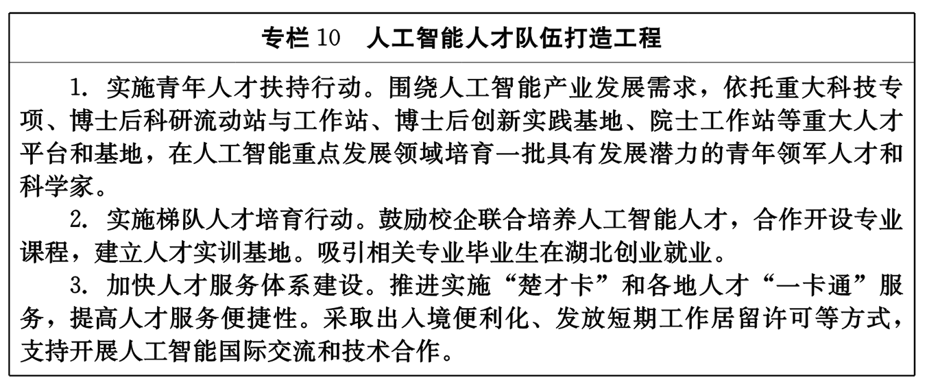 (四)構建人工智能人才高地。引導和鼓勵高校設立人工智能相關學科專業,支持高校人工智能學科建設。構建政產學研用聯動的人才需求對接和定向培養機制,依托武漢大學、華中科技大學、武漢理工大學等高校以及中科院測量與地球物理研究所等科研院所科教資源,加大人工智能人才培養力度,構建面向產業發展前沿的多層次、高質量人才團隊。鼓勵校企合作,在人工智能重點發展領域培育一批具有發展潛力的青年領軍人才和科學家。大力引進人工智能基礎理論、關鍵技術等領域的高端緊缺人才和高水平創新團隊。支持市場化培訓機構、人才繼續教育實訓基地和高技能人才培養基地等,開展人工智能緊缺急需專業技術人才和高技能人才培訓。鼓勵人工智能企業通過長短期聘用、項目合作、技術咨詢等柔性引才方式,靈活引進高端人才。向入選“楚才引領計劃”的人工智能領域高端緊缺人才發放“楚才卡”,提供落戶居留、子女就學、醫療保健、安居保障、出入境等“一卡通”專員服務。發揮股權激勵專項基金、人才發展基金等作用,留住并激勵人工智能高端人才。