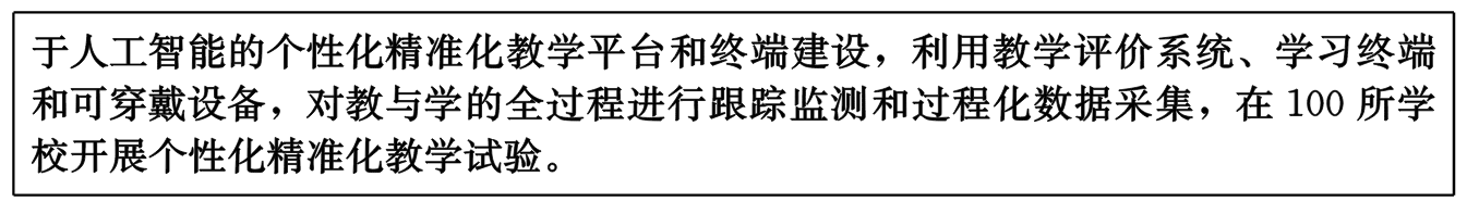 3.智能教育。積極推進基于教育大數據的智能產品與服務在教育教學、教育管理、教育評價、生活服務等方面的全流程應用,推動教育模式變革和生態重構。推進智慧校園建設,構建以學習者為中心的智能化教育教學環境。推進虛擬仿真實驗教學,加快建設在線智能教室、智能實驗室、虛擬工廠(醫院)等智能學習空間。推進基于人工智能的精準化教學和個性化學習,推動智能教學助手和智能學伴應用,提高教與學的效率。開展智慧教育示范區創建和智能教育試點示范學校建設,支持武漢市建設國家智慧教育示范區。