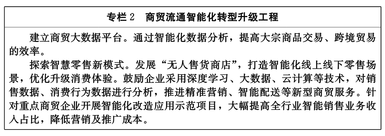 3.智能商務。鼓勵跨媒體分析與推理、知識計算引擎與知識服務等新技術在商務領域應用,推廣基于人工智能的新型商務服務與決策系統。積極支持各類特色商務云平臺、電子商務服務平臺發展,推進商務信用信息綜合平臺建設,加快推動企業及平臺數字化、智能化轉型。拓展商務大數據采集和分析應用,加快精準營銷、智能配送、供應鏈管理等新型商貿服務發展,支持人工智能技術在現代商務全流程的示范應用及創新。