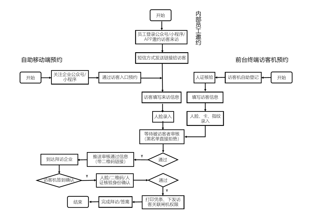 ? ? ? ? 訪客來訪時,到達企業前臺在訪客機終端進行信息確認,在訪客機終端進行人臉/ 人證識別打印訪客標簽,同時系統會下發訪客相關的門禁通道、停車場等權限。訪客拜訪完成之后可通過訪客機終端、門禁終端、停車終端、系統自動預約到期等方式實現簽離,每一個環節均支持短信和公眾號推送消息提醒。