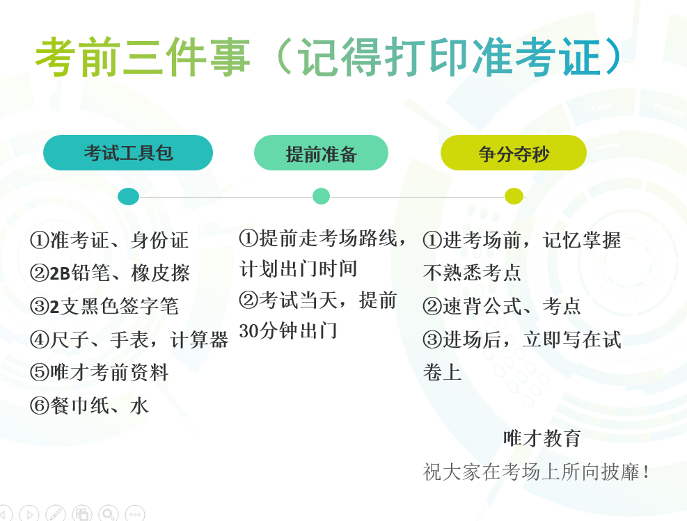 1、考試用品準備:準考證、身份證、黑色墨水筆、2B鉛筆、橡皮、直尺、無聲無文本編輯功能的計算器。禁止將各種通信工具或其它電子設備帶至考場。