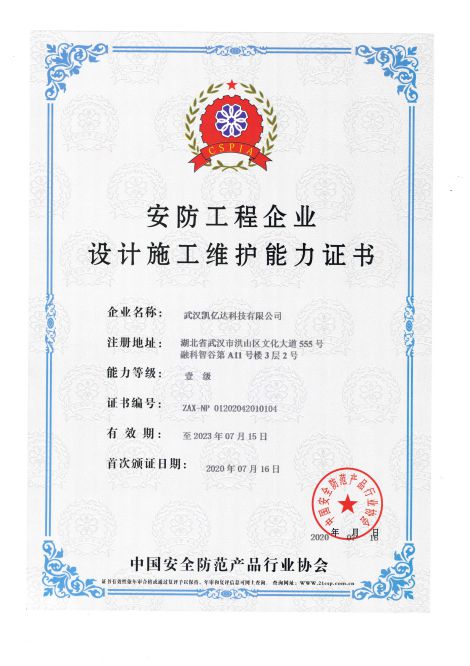 安防工程企業(yè)設(shè)計施工維護能力一級證書