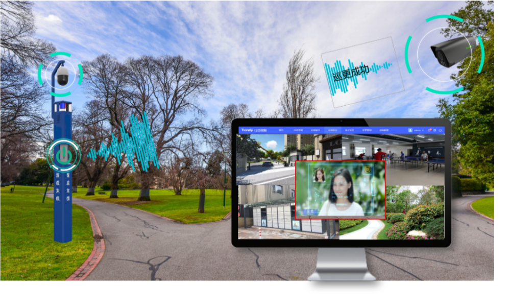 社區(qū)空曠區(qū)域可部署一鍵報(bào)警系統(tǒng),當(dāng)有壞人尾隨或者老人突發(fā)疾病,可按下報(bào)警按鈕,同步畫面會(huì)通過(guò)報(bào)警柱上方球機(jī)回傳給報(bào)警中心,報(bào)警中心能實(shí)現(xiàn)對(duì)現(xiàn)場(chǎng)的可視化對(duì)講。此外在社區(qū)部署巡更設(shè)備,巡更人員可實(shí)現(xiàn)人臉識(shí)別打卡,識(shí)別成功自定義語(yǔ)音提示,巡更記錄由后端平臺(tái)進(jìn)行查詢。