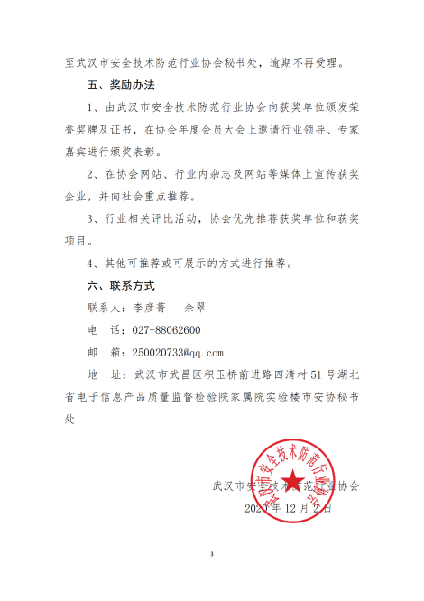 1、由武漢市安全技術防范行業協會向獲獎單位頒發榮譽獎牌及證書,在協會年度會員大會上邀請行業領導、專家嘉賓進行頒獎表彰。