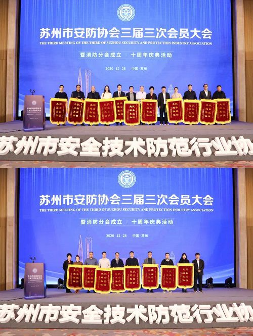 大會(huì)宣讀了2020年蘇州市安防協(xié)會(huì)工作報(bào)告、2020年蘇州市安防協(xié)會(huì)財(cái)務(wù)報(bào)告、監(jiān)事會(huì)工作報(bào)告等內(nèi)容。大會(huì)為3位新任分會(huì)理事長(zhǎng)單位、5家新任副理事長(zhǎng)單位、18家新任理事單位授牌。會(huì)上進(jìn)行了突出貢獻(xiàn)獎(jiǎng)、星級(jí)誠(chéng)信企業(yè)、抗疫先進(jìn)集體等各項(xiàng)表彰。其中,我會(huì)秘書(shū)長(zhǎng)陳虎為抗疫先進(jìn)集體頒發(fā)錦旗并合影留念。