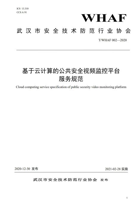 2021年1月5日,武漢市安全技術防范行業(yè)協(xié)會在全國團體標準信息平臺發(fā)布團體標準公告,根據(jù)本協(xié)會的標準工作管理辦法,完成了《基于云計算的公共安全視頻監(jiān)控平臺服務規(guī)范》(T/WHAF 002—2020)團體標準的制定工作。