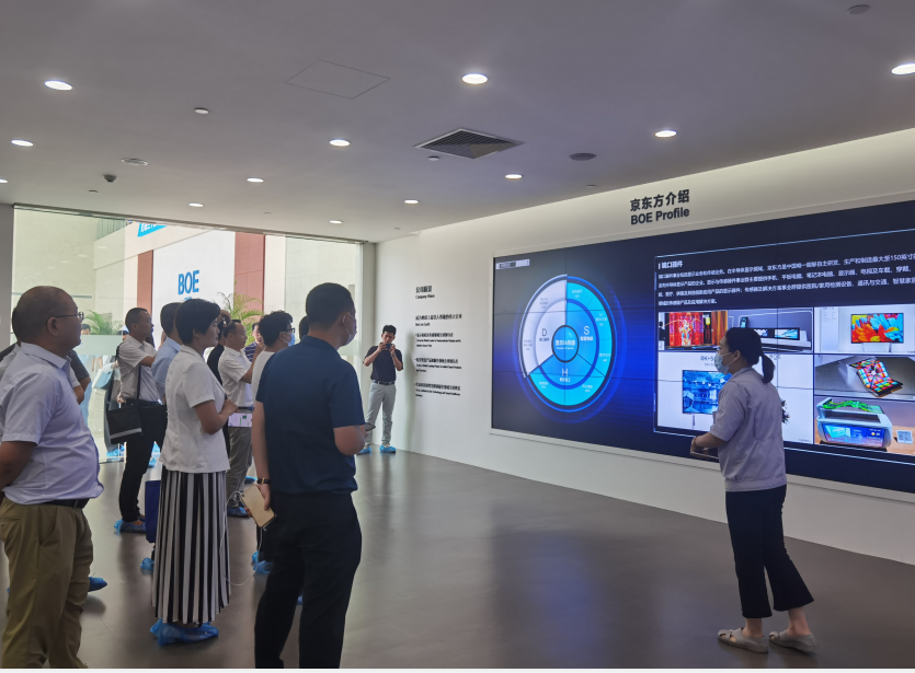 然后,協會隊伍參觀了京東方科技集團股份有限公司,京東方創立于1993年4月,是一家為信息交互和人類健康提供智慧端口產品和專業服務的物聯網公司,形成了以半導體顯示事業為核心,Mini LED、傳感器及解決方案、智慧系統創新、智慧醫工事業融合發展的“1+4+N”航母事業群。