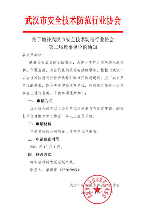 關(guān)于增補(bǔ)武漢市安全技術(shù)防范行業(yè)協(xié)會(huì)第二屆理事單位的通知