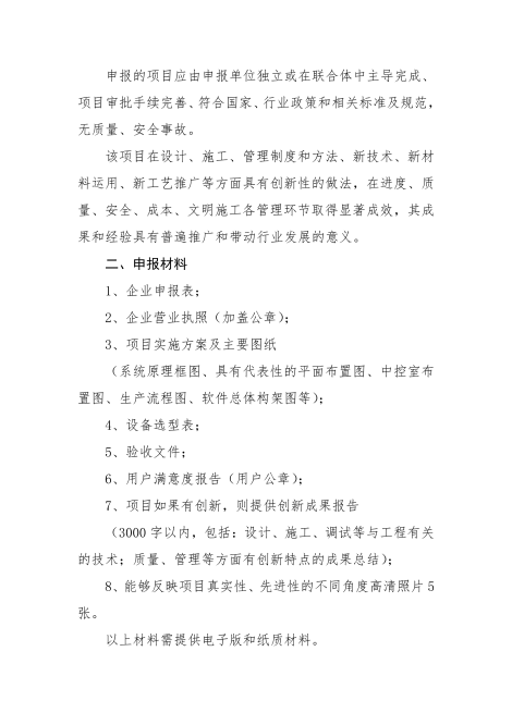 申報的項目應由申報單位獨立或在聯合體中主導完成、項目審批手續完善、符合國家、行業政策和相關標準及規范,無質量、安全事故。
